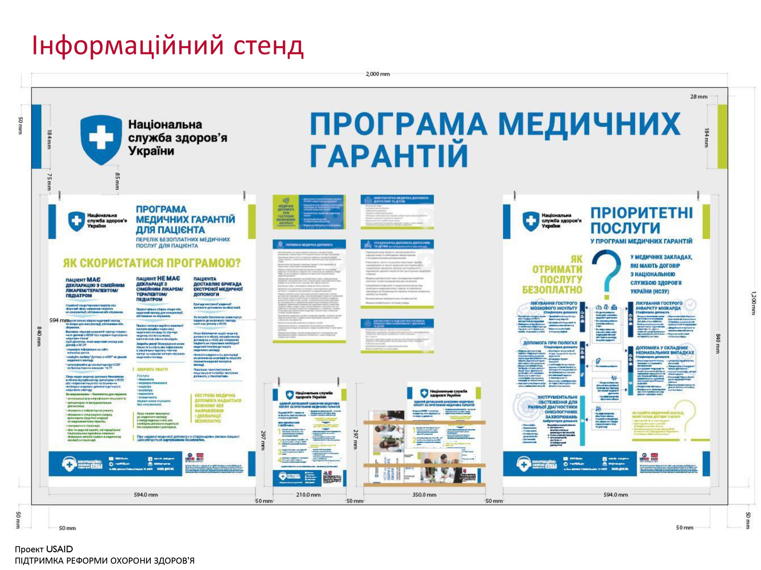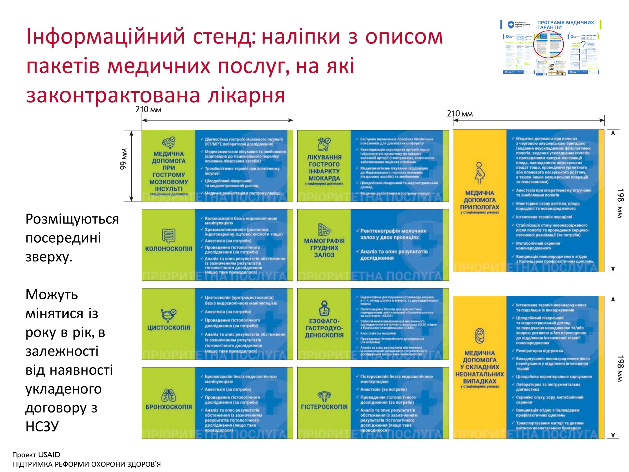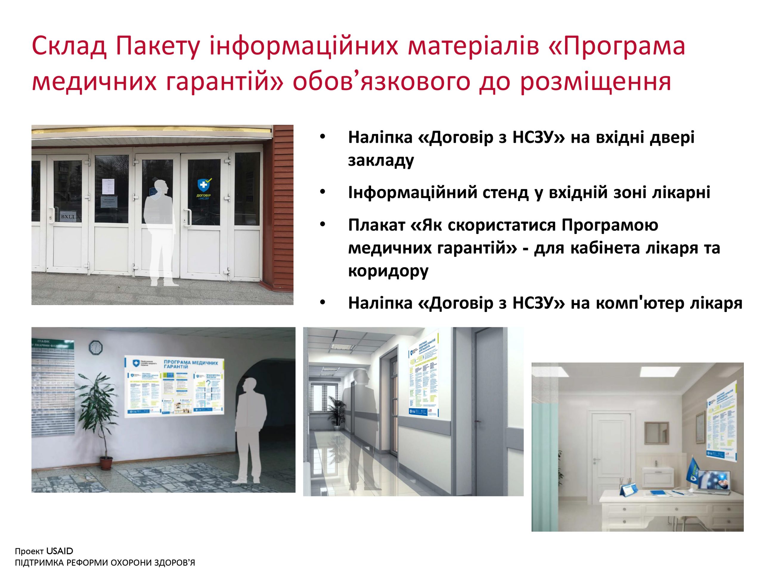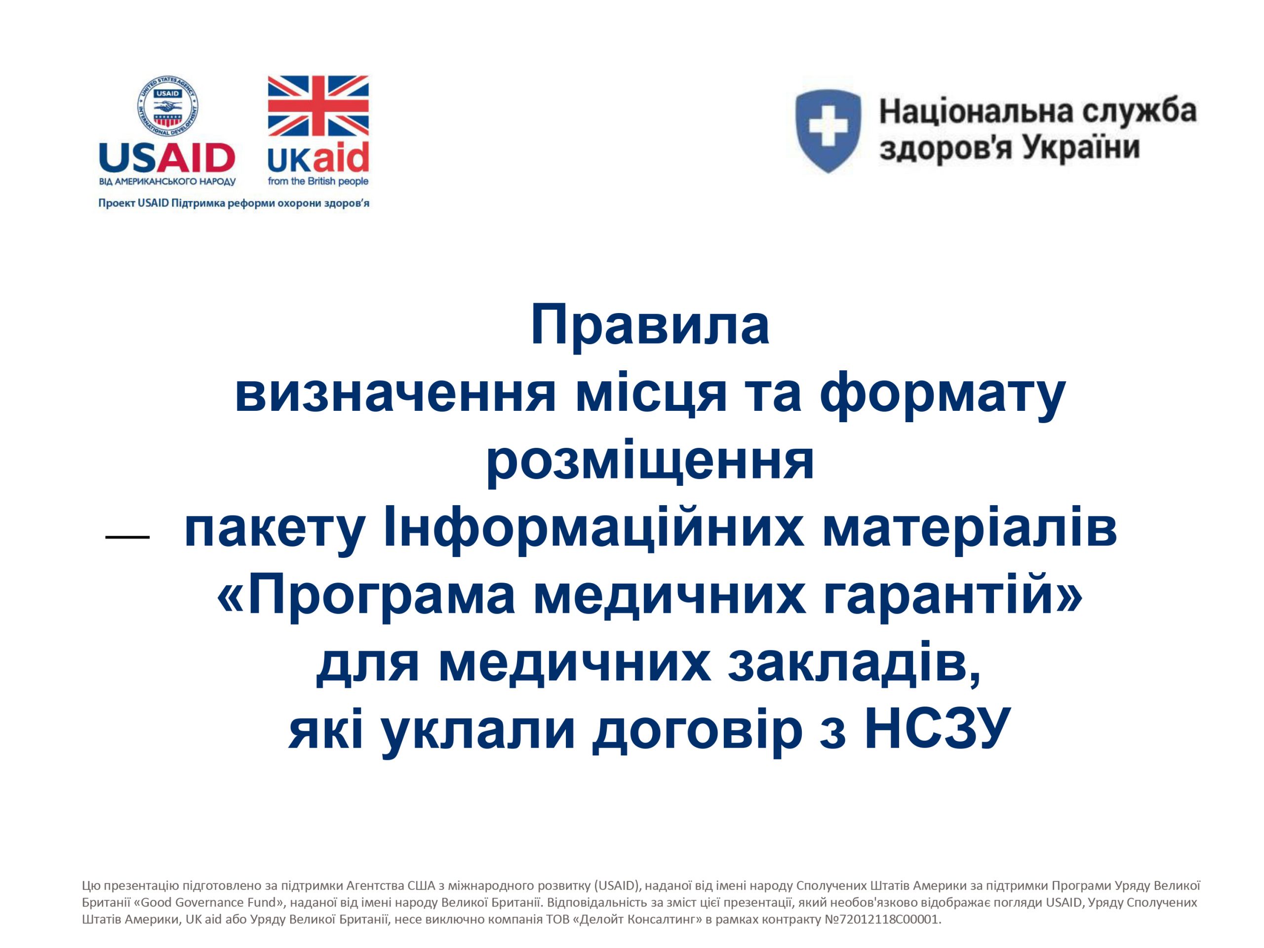 Національна служба здоров’я України за сприяння Проекту USAID/ UKaid «Підтримка реформи охорони здоров’я» розробила та направила медичним закладам, які уклали договір з НСЗУ, інструктивний лист № 2593/11-17-21 від 11.02.2021 р. щодо обов’язкових правил визначення місця та формату пакету Інформаційних матеріалів «Програма медичних гарантій» для пацієнтів.